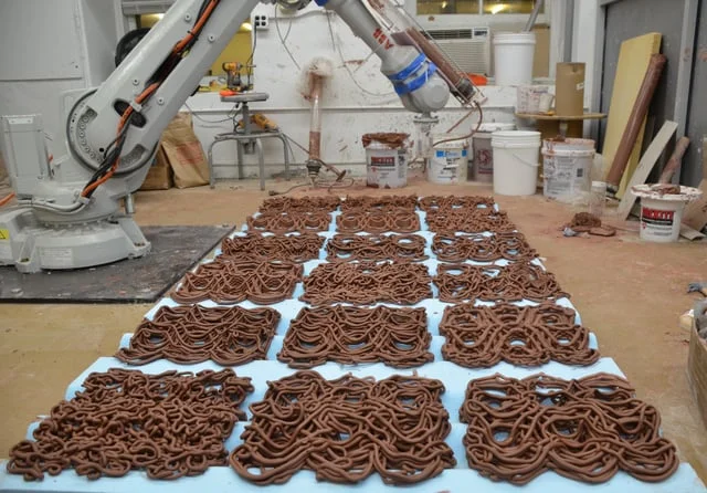 Clay Non-Wovens develops a new approach for robotic fabrication, applying traditional craft methods and materials to a fundamentally technical and precise fabrication methodology. This paper includes new explorations in robotic fabrication, additive manufacturing, complex patterning, and techniques bound in the arts and crafts. Clay Non-Wovens seeks to develop a system of porous cladding panels, which negotiate circumstances of natural daylighting through parameters dealing with textile (woven and non-woven) patterning and line typologies. While additive manufacturing has been built predominantly on the basis of extrusion, technological developments in the field of 3D Printing seldom acknowledge the bead or line of such extrusions as more than a nuisance. Blurring of recognizable layers is often seen as progress, but it does away with visible traces of a fabrication process. Historically, however, construction methods in architecture and the building industry have celebrated traces of making ranging from stone cutting to log construction. With growing interest in digital craft within the fields of architecture and design, we seek to reconcile our relationship with the extruded bead and re-interpret it as a fiber and three-dimensional drawing tool. The traditional clay coil is to be reconsidered as a structural fiber rather than a tool for solid construction. In order to build upon this body of robotically fabricated clay structures, three distinct but connected challenges existed: 1. Construction of a simple end effector for extrusion; 2. Development of a clay body and; 3. Using computational design tools to develop formwork and toolpath geometries.
